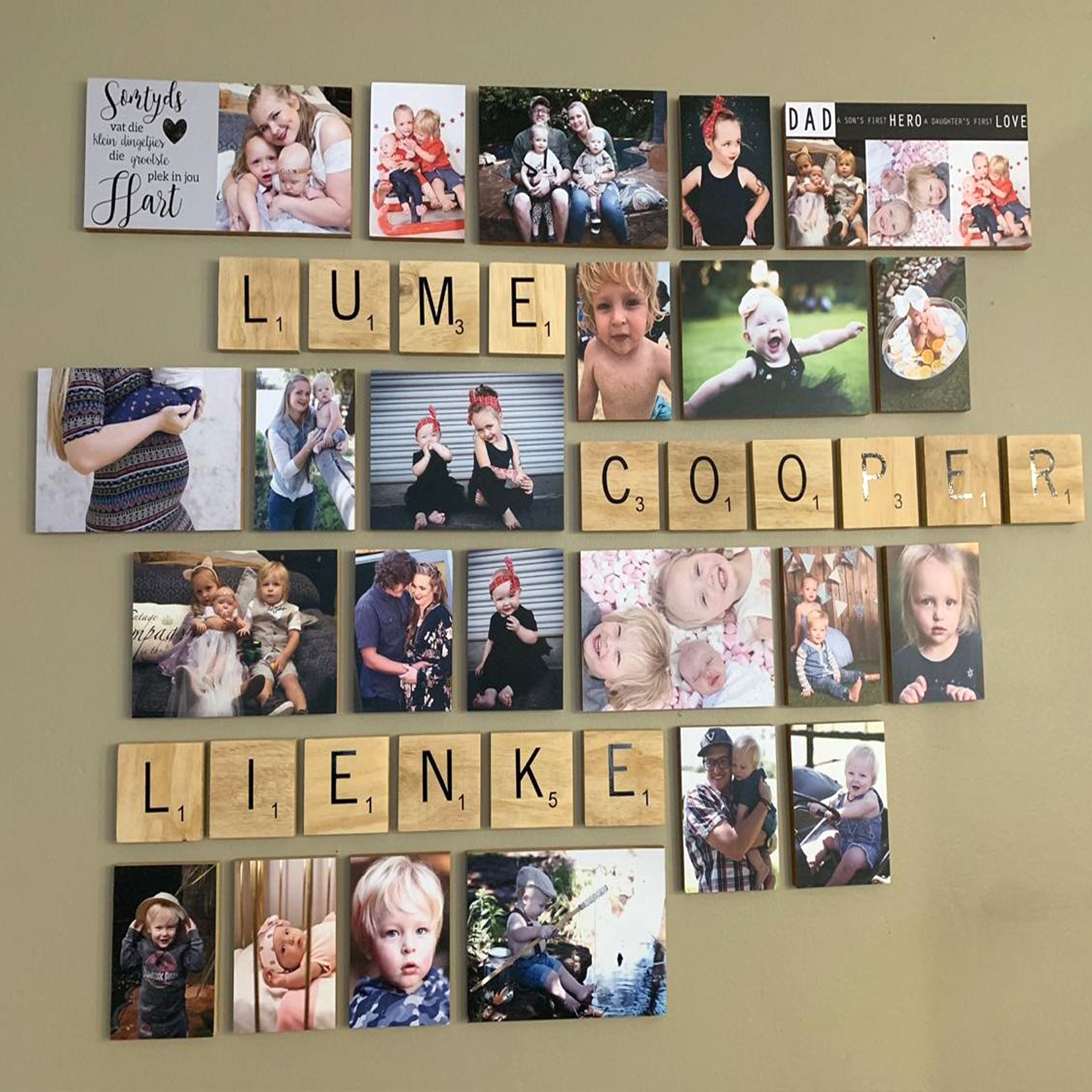 Transform your walls into a personal statement with our custom Scrabble letter blocks. Perfect for spelling out names, surnames, or special words, these unique pieces add a personalized and playful touch to any room. They are ideal for creating a focal point or for adding to a gallery wall alongside photo blocks and other decor.